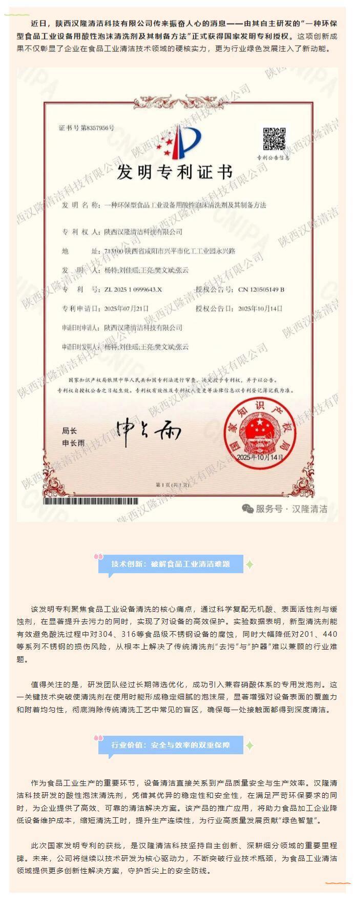 【喜讯】汉隆公司“酸性泡沫清洗剂”获得国家发明专利,促进食品清洁新升级!