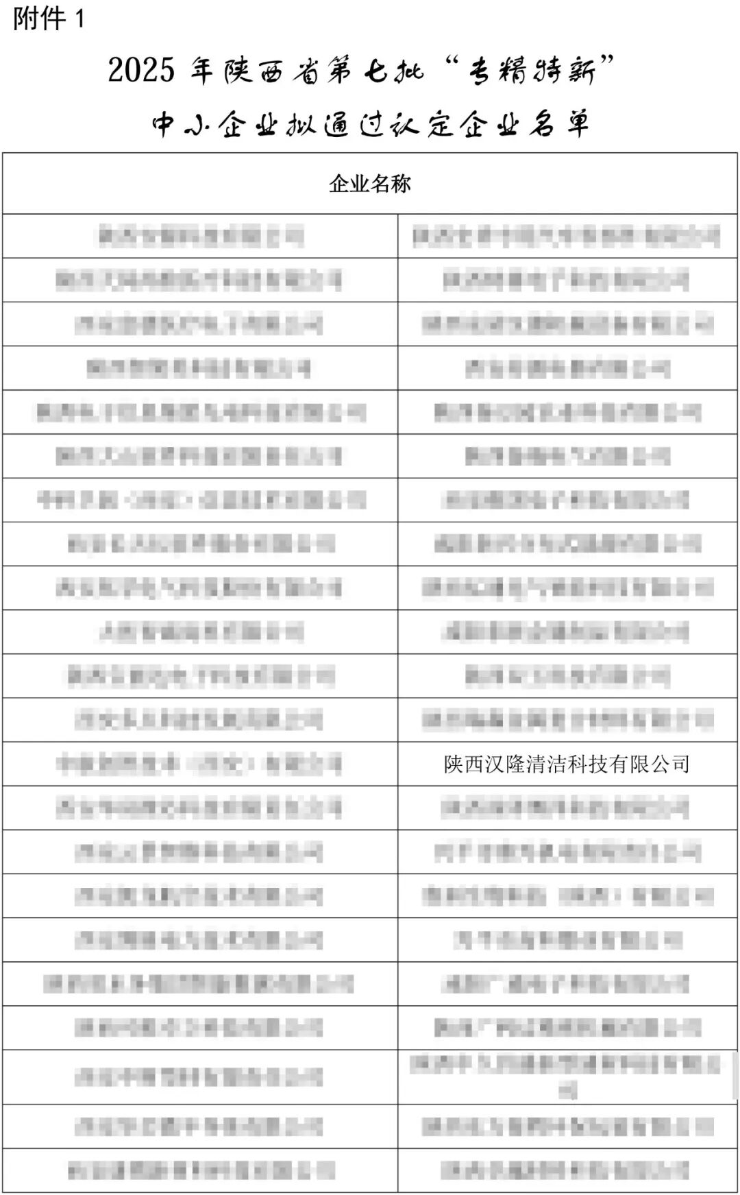 近日,陕西省工业和信息化厅发布了2025年陕西省“专精特新”中小企业认定名单,陕西汉隆清洁科技有限公司成功入选,荣获2025年陕西省“专精特新”中小企业认定!